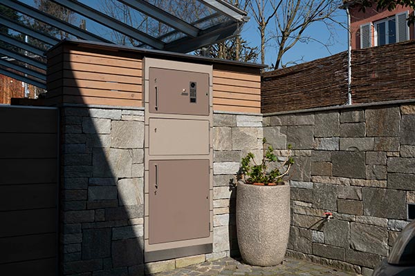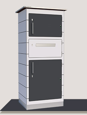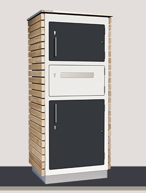 Dieser Paketkasten ist dank der HPL Faserplatten von Trespa besonders witterungsbeständig. Wählen Sie aus über hundert Farben.