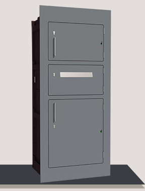 Der Zusteller kann im Inneren des Paketkasten durch einfaches Kippen, die Pakete auf die mittlere undgepolsterte Trennklappe gleiten lassen. Möchte der Zusteller ein sehr großes Paket abgeben, braucht er dazu nur die untere Türe öffnen, das Paket einlegen und die Türe schließen.